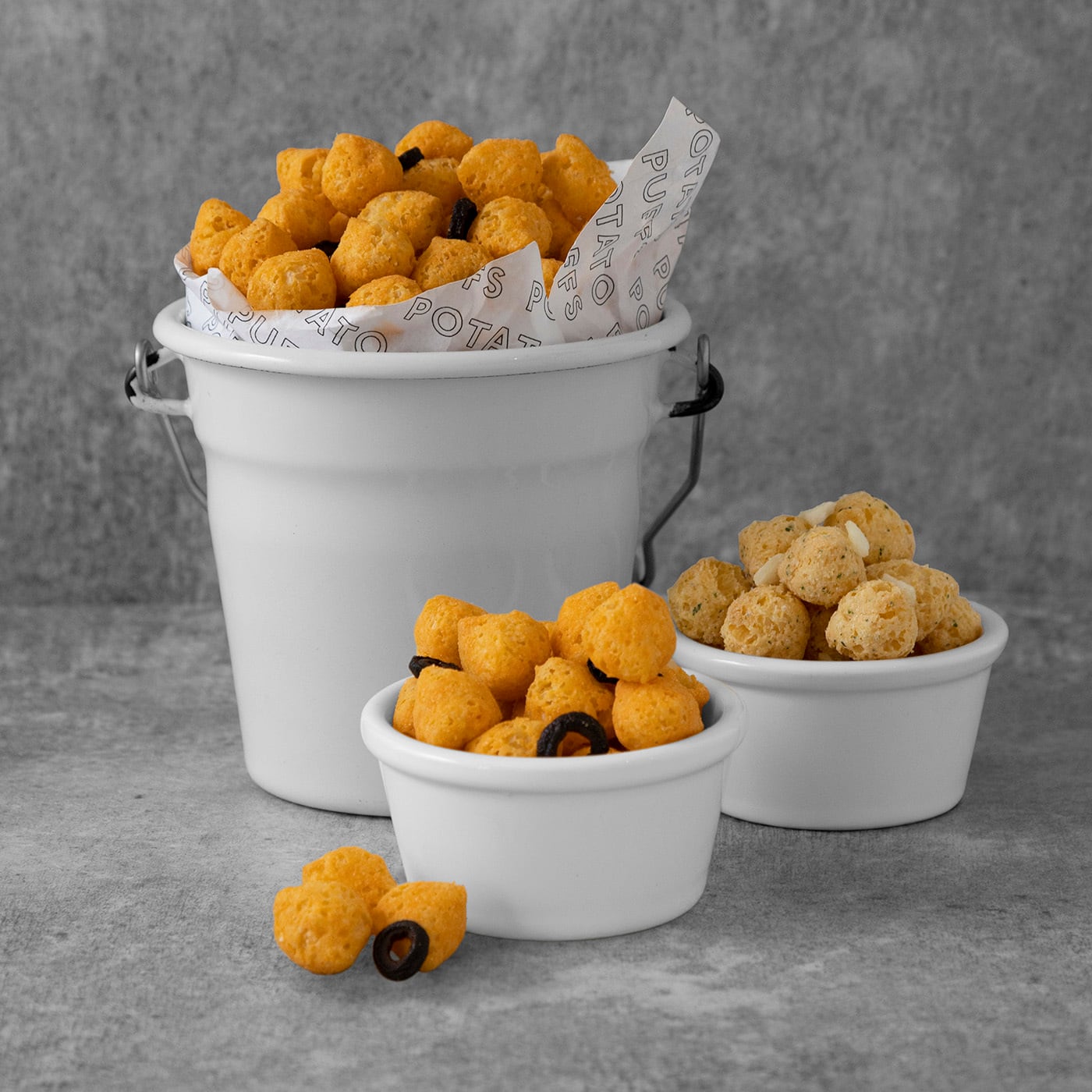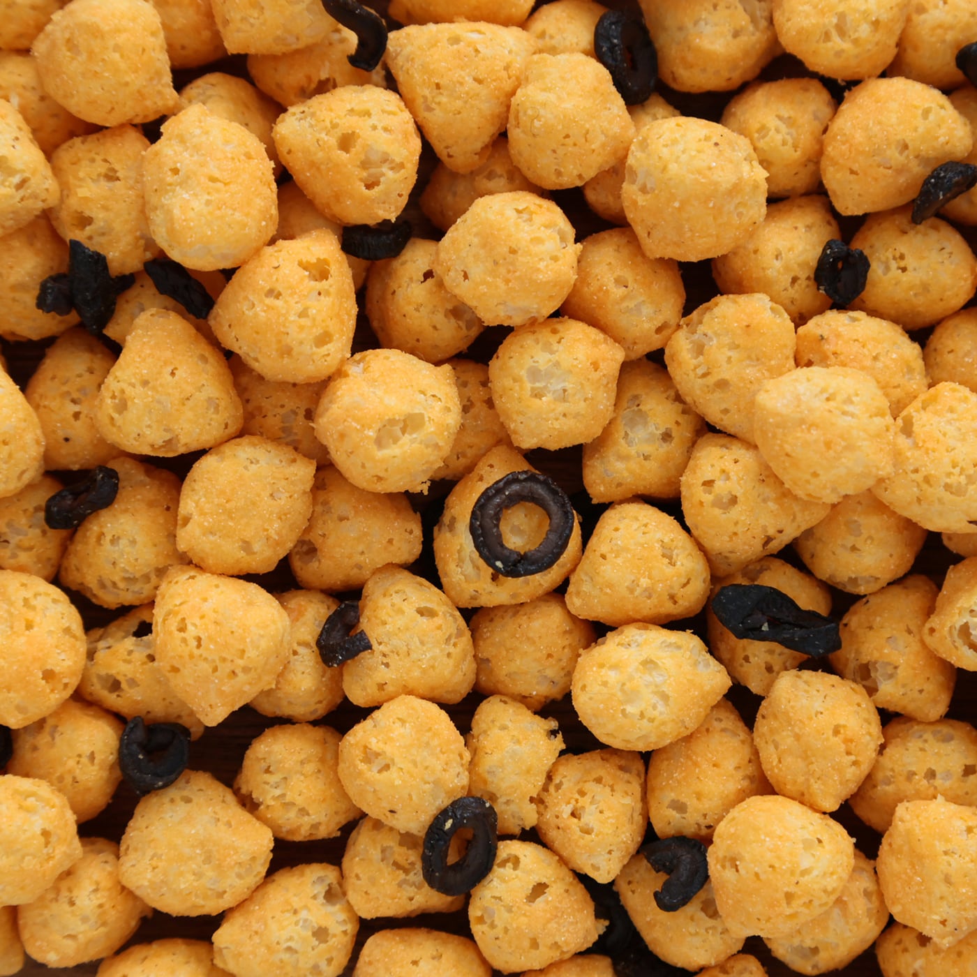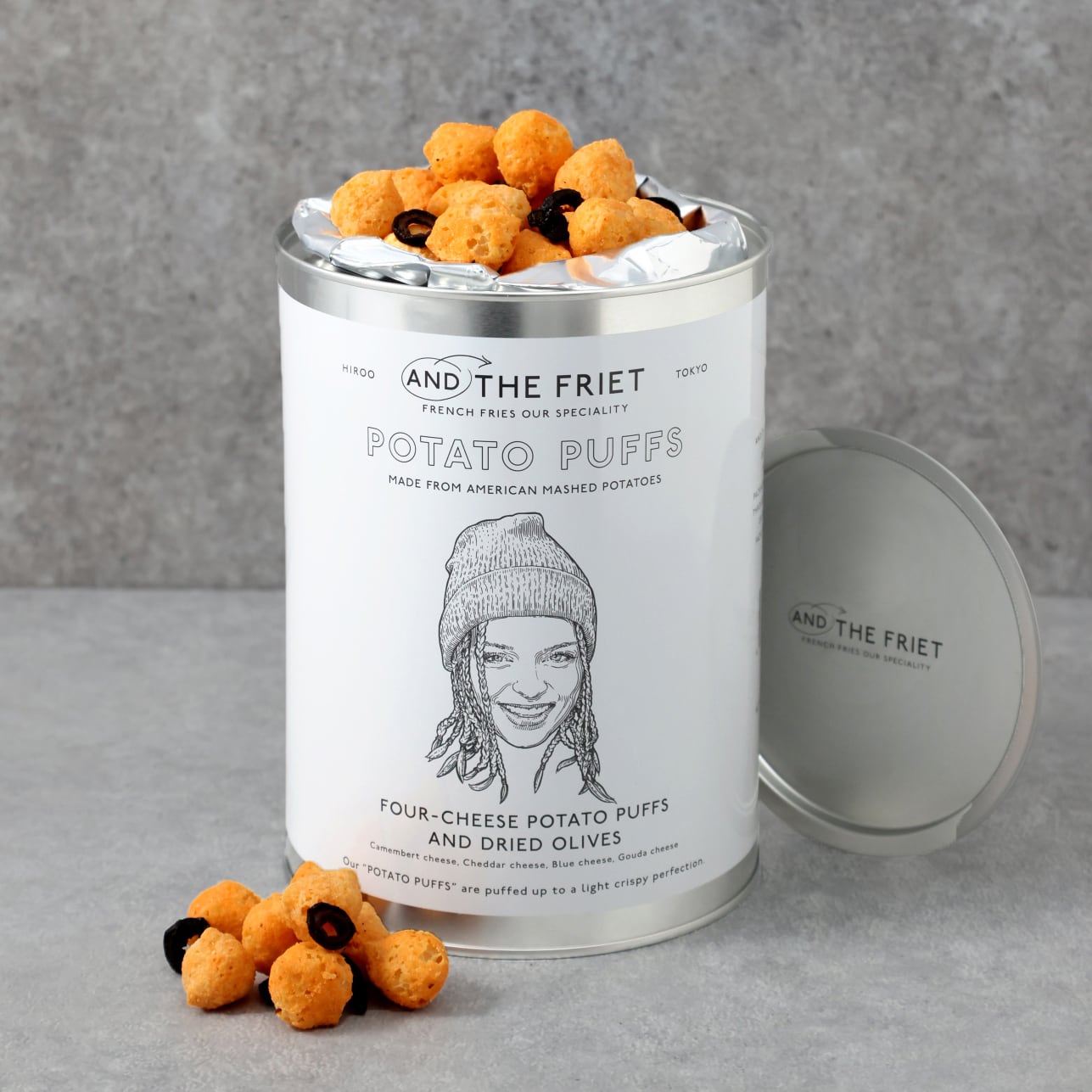 新感覚でリッチなパフスナック「POTATO PUFFS(ポテトパフ)」。クワトロチーズ(カマンベール、チェダー、ゴーダ、ブルーチーズ)フレーバーのポテトパフに、乾燥させた塩蔵オリーブを加えました。4種のチーズのコクとオリーブの旨味をお楽しみください。