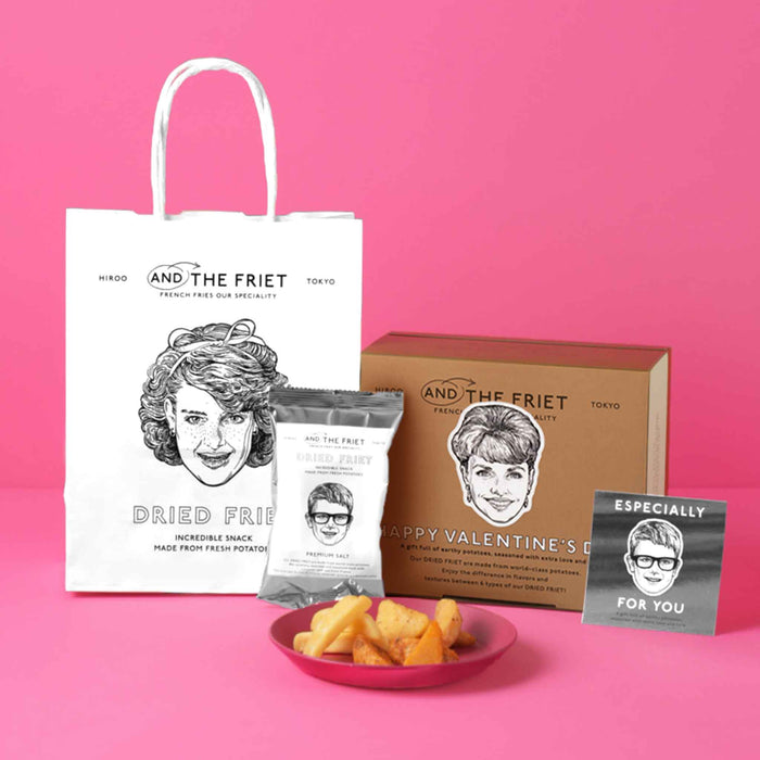 描きおろしイラストが楽しめるバレンタイン仕様のスリーブボックスに、贈り物にぴったりなFOR YOUのメッセージカードと紙袋が付いたお得なセット。6種類のドライフリットを食べくらべできるこだわりのボックスをそのままバレンタインギフトに活用できる、オンラインストア限定のセットです。