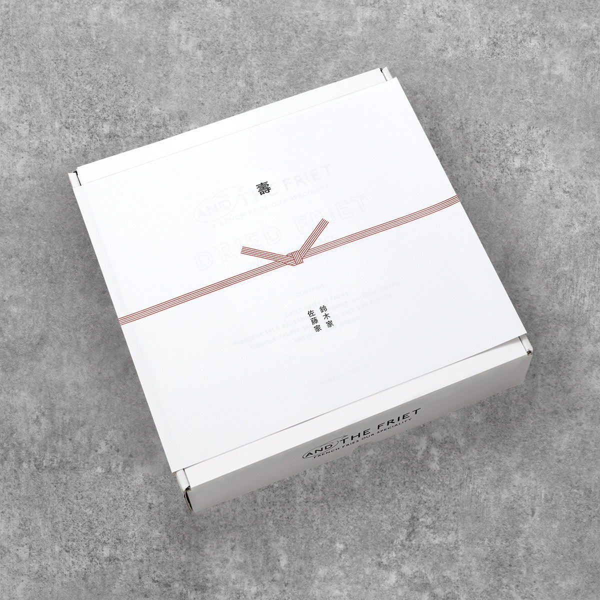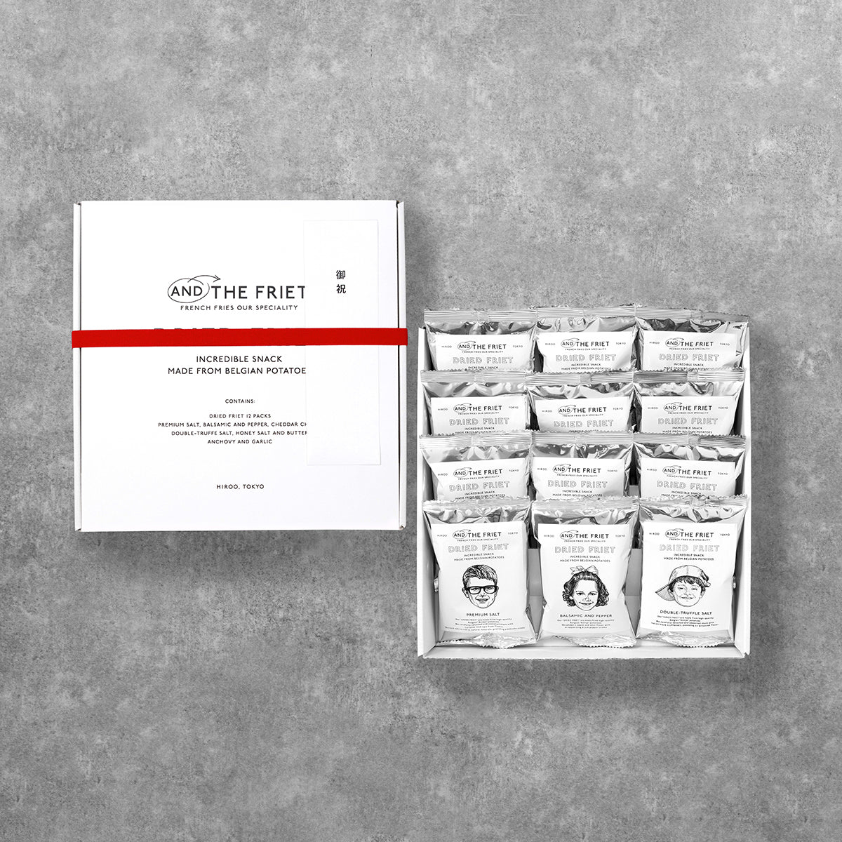 フォーマルからカジュアルな場面まで幅広く使えるギフトボックスです。 AND THE FRIETがこだわって世界各国から選び抜いたじゃがいもを使い、じっくり丁寧に仕上げることで、サクサクとした食感とじゃがいもそのものの旨みを楽しめます。平林奈緒美氏が手がけるパッケージとAnje Jager氏のイラストで、手に取った方が笑顔になるちょっと特別な一品に仕上がっています。