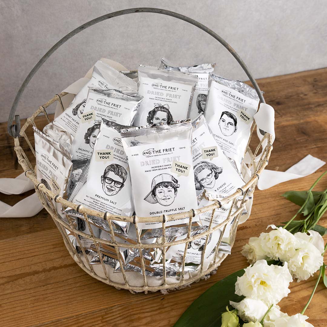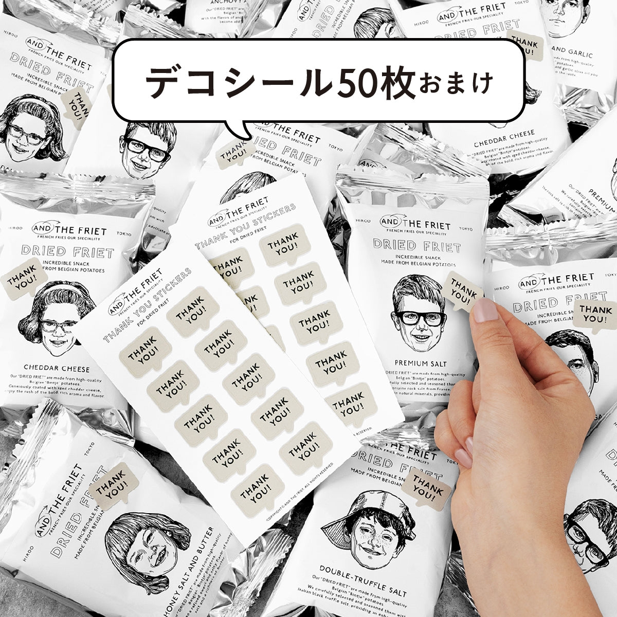 人気のドライフリットミニ個包装50個に、1,750円分のTHANK YOUデコシール(5シート50枚)をプレゼント。デコシール付きのお得な大容量セットは配布用のギフトに最適。50名様に1個ずつ、10名様に5種フレーバーを1個ずつなど、感謝を伝えたい方の数に合わせてお贈りいただけます。