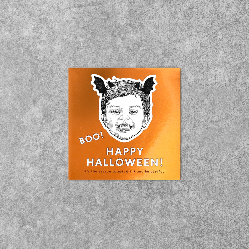 5種類のミニ個包装を詰め合わせたギフトボックスに、ハロウィーン限定のメッセージカードを付けた今だけのセット。メタリックオレンジ色のカードは、ドラキュラの仮装をした男の子のいたずらっぽい表情がポイントです。ギフト人気No.1のミニ10個入りをハロウィーンの贈り物にぜひ。