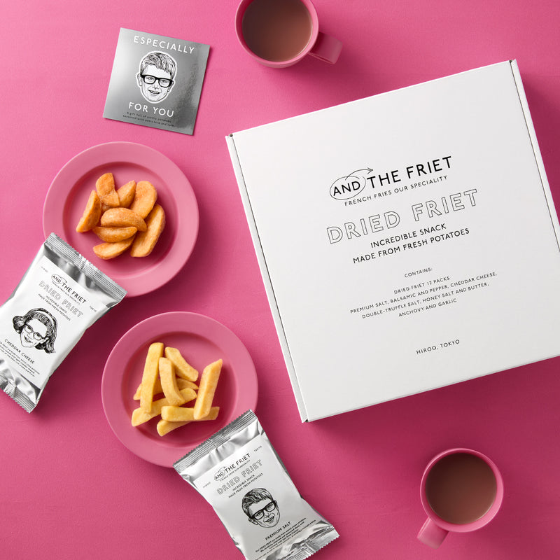 AND THE FRIETがこだわって世界各国から選び抜いたじゃがいもを使い、じっくり丁寧に仕上げることで、サクサクとした食感とじゃがいもそのものの旨みを楽しめます。平林奈緒美氏が手がけるパッケージとAnje Jager氏のイラストで、手に取った方が笑顔になるちょっと特別な一品に仕上がっています。