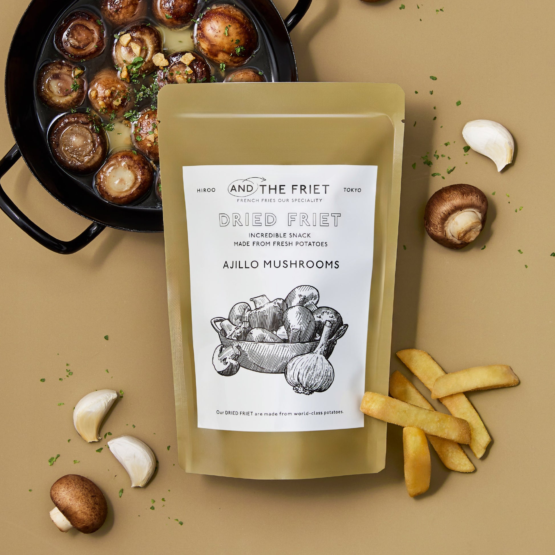たっぷり効かせたガーリックと香り豊かなマッシュルーム、濃厚な旨味が溶け込んだオリーブオイルの味わいを、フレンチフライの本場ベルギーから直輸入したジャガイモで作られたドライフリットにぎゅっと凝縮。噛むほどに広がる芳醇さは、大人の舌をうならせる、まるで一品料理のようなおいしさです。
